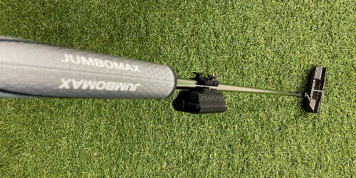 この商品の特徴は、最近流行の手首を使わずにストロークする練習をするための物で、かなりの太さがあります。取り外しも簡単にできるので(接着剤を使わなければ)、まずはシャフト延長もせずにそのまま装着してみました。