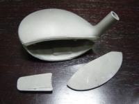 上の写真は現在発売中のFWの型から出したままのパーツです。一番左の写真はソール側ですが、製品では中央のくぼみの部分に比重の重い金属が圧着されます。フェース面も別パーツになっており、右の写真を見ていただくとわかるように3つのパーツからヘッドができあがっています。