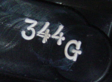 正面から見ると、ヒール側にT.P.MILLSの刻印がハンドスタンプで入れられています。右側の写真はキャビティ内にある刻印で、ヘッド重量の「344G」がこれもハンドスタンプで入れられています。